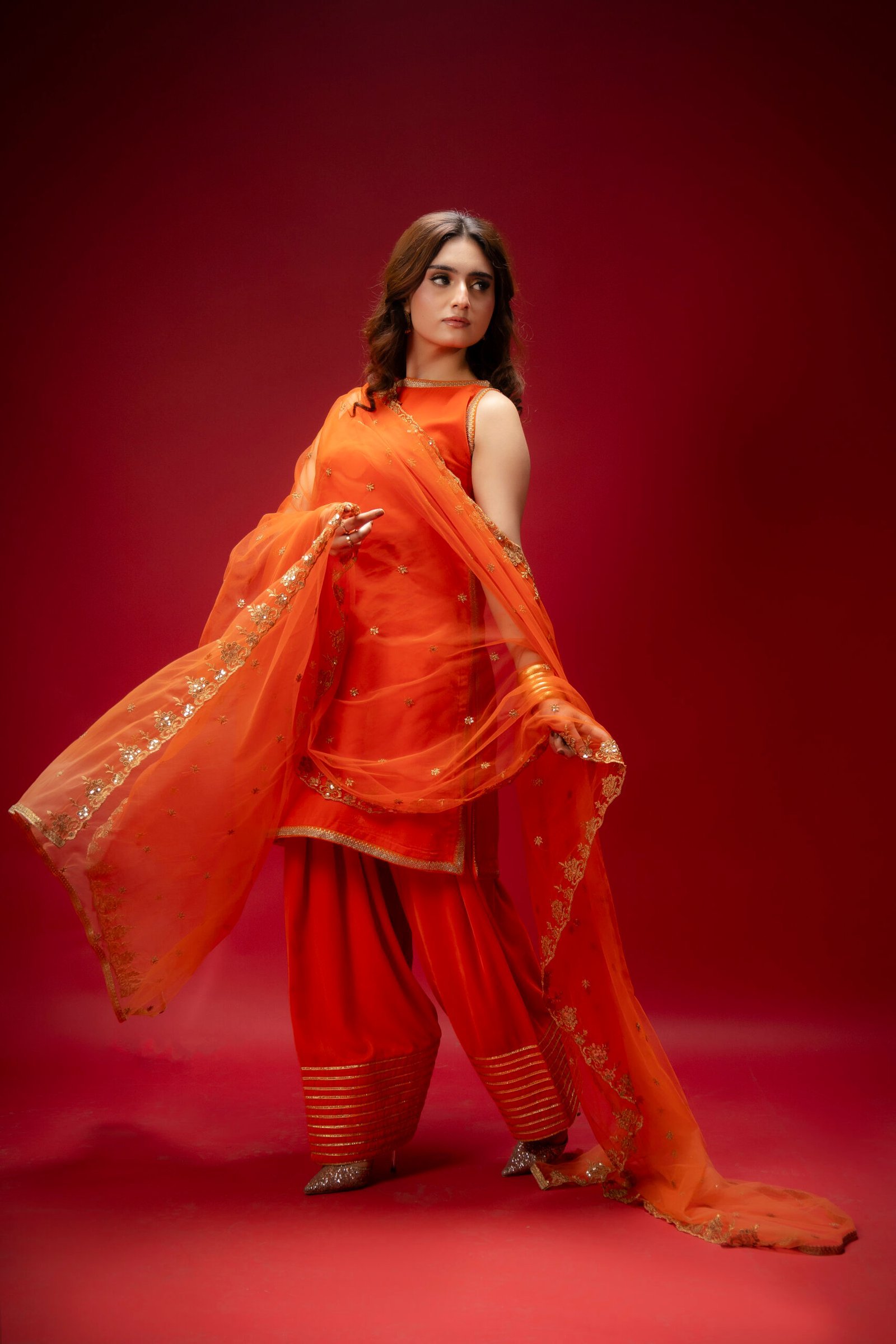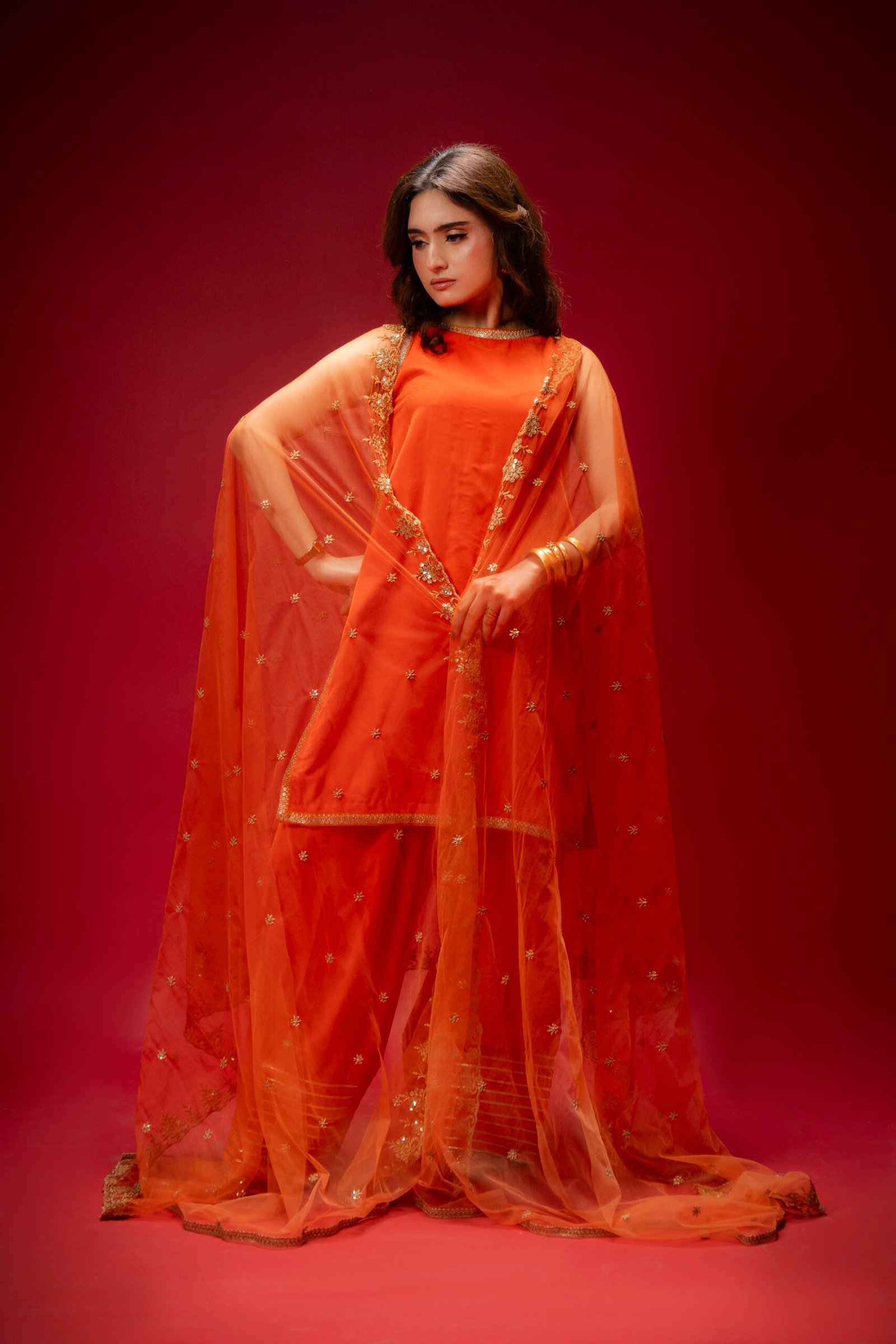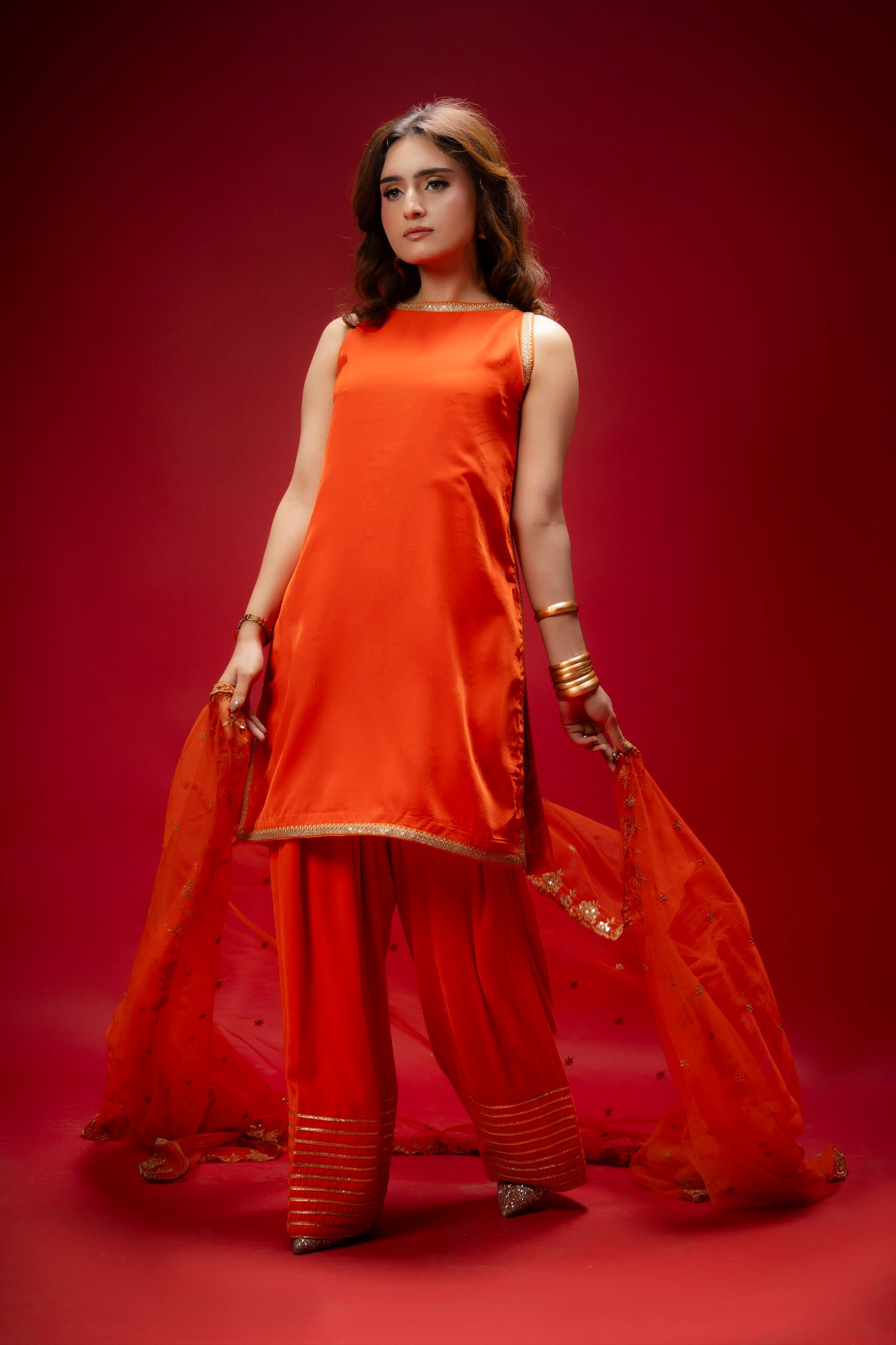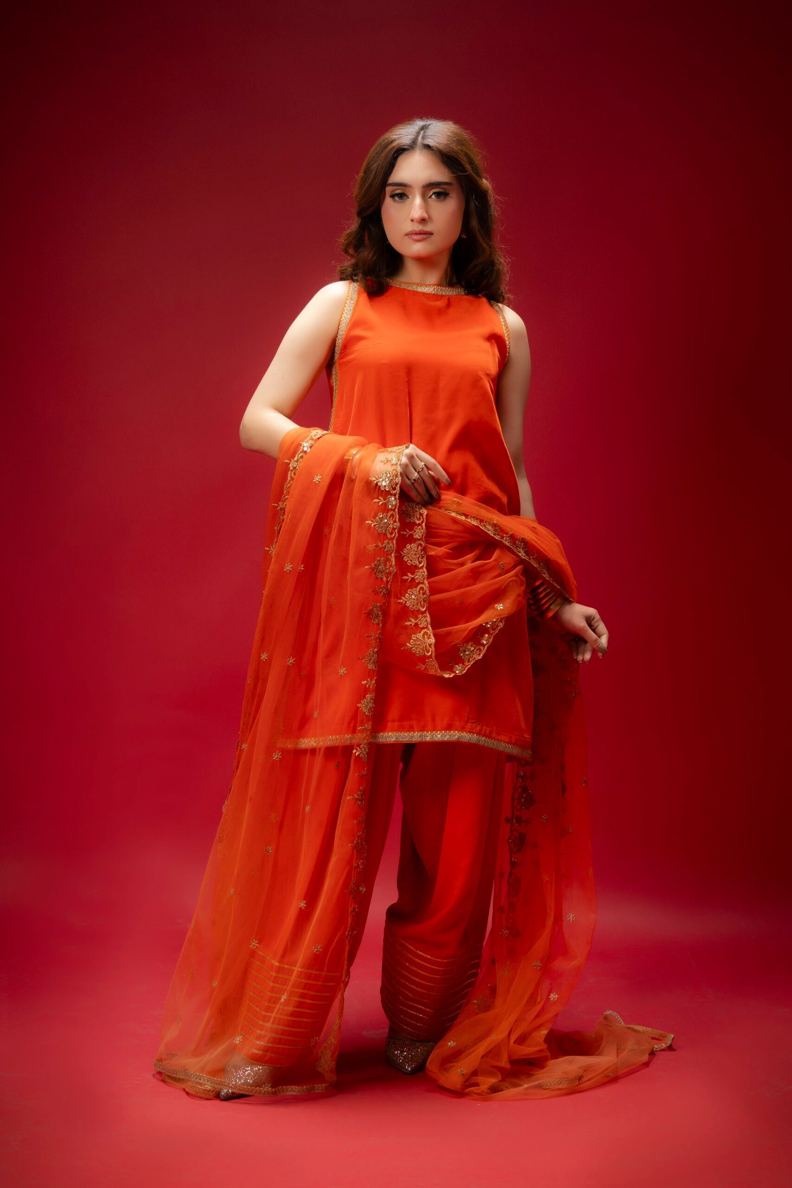 A perfect blend of elegance and simplicity, this orange velvet ensemble is designed to make a statement with subtle charm. The shirt is adorned with delicate lace, while the farshi shalwar adds a graceful, flowing silhouette enhanced by intricate lace detailing. Completing the set is a beautifully embellished net dupatta, adding a soft, festive touch to this classic and affordable dress.
