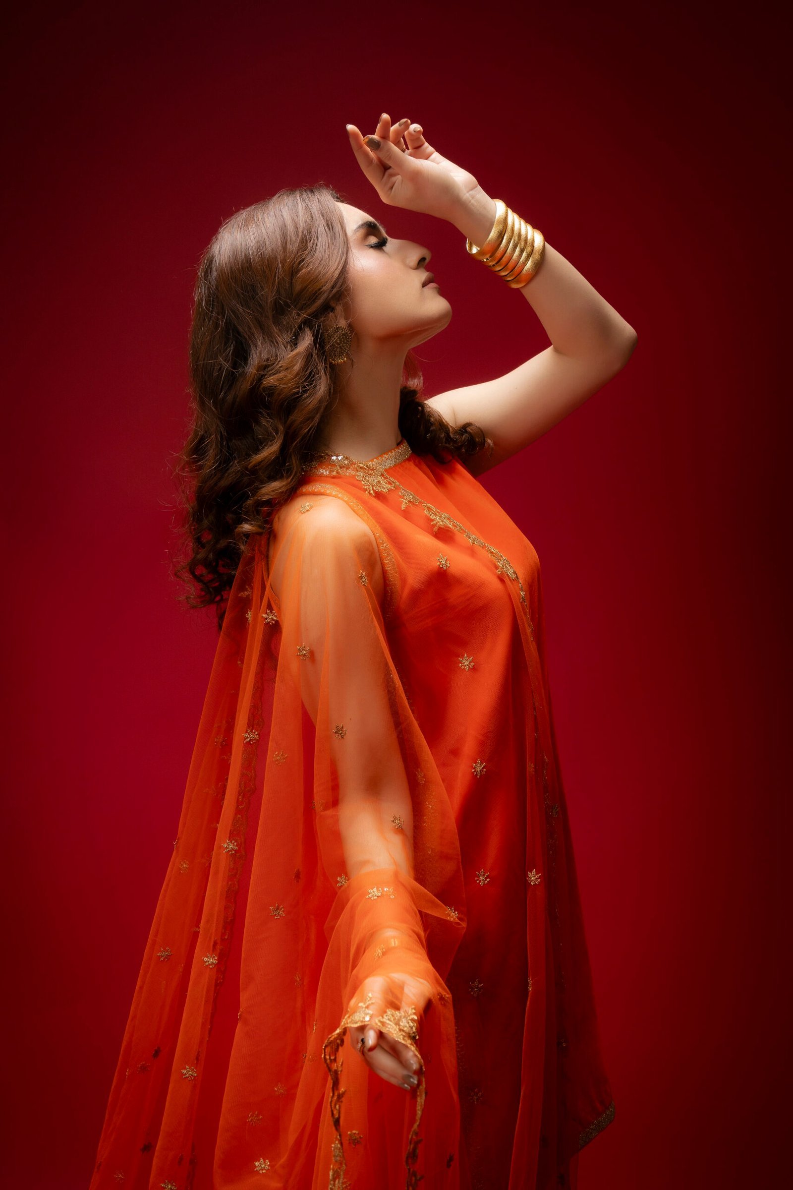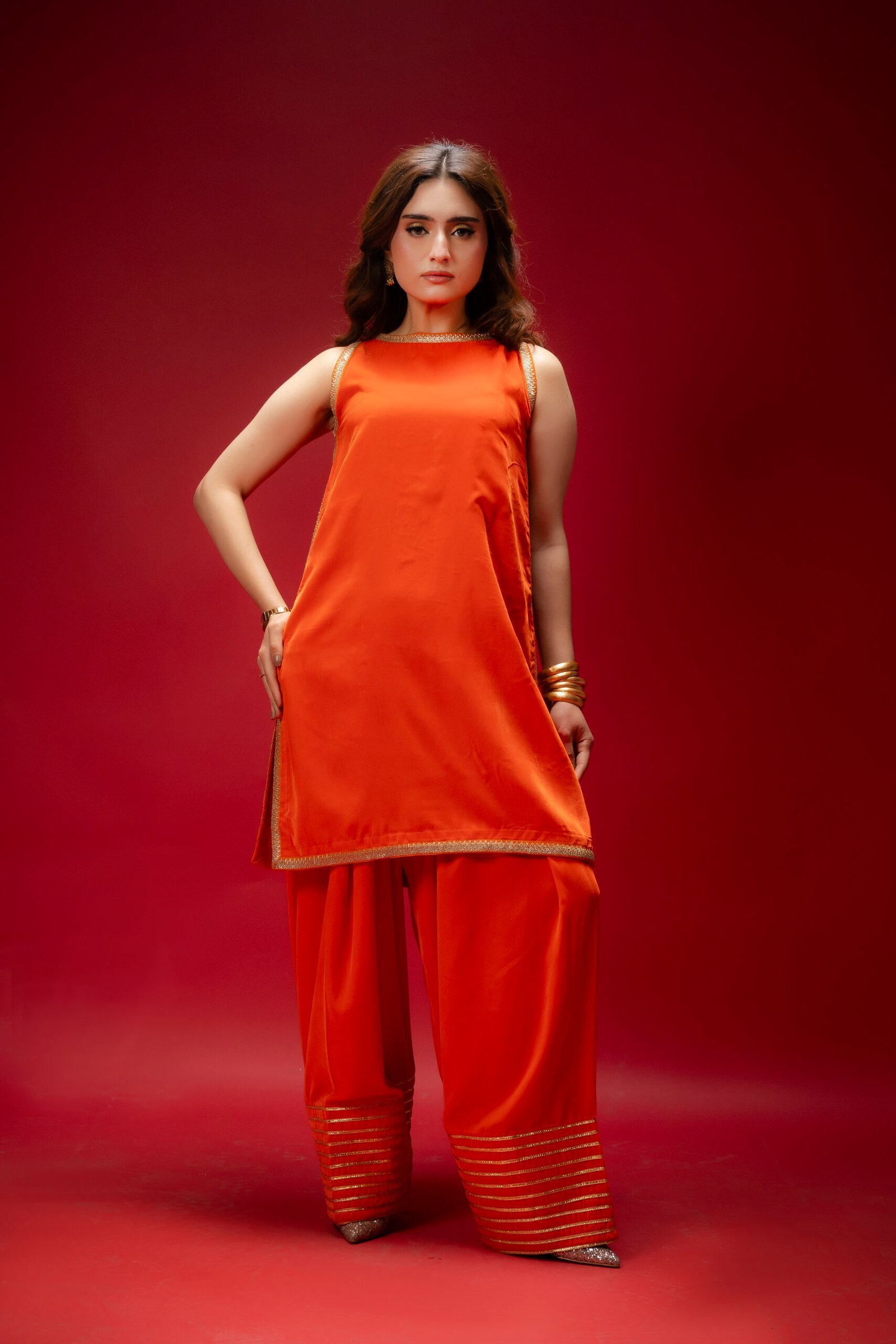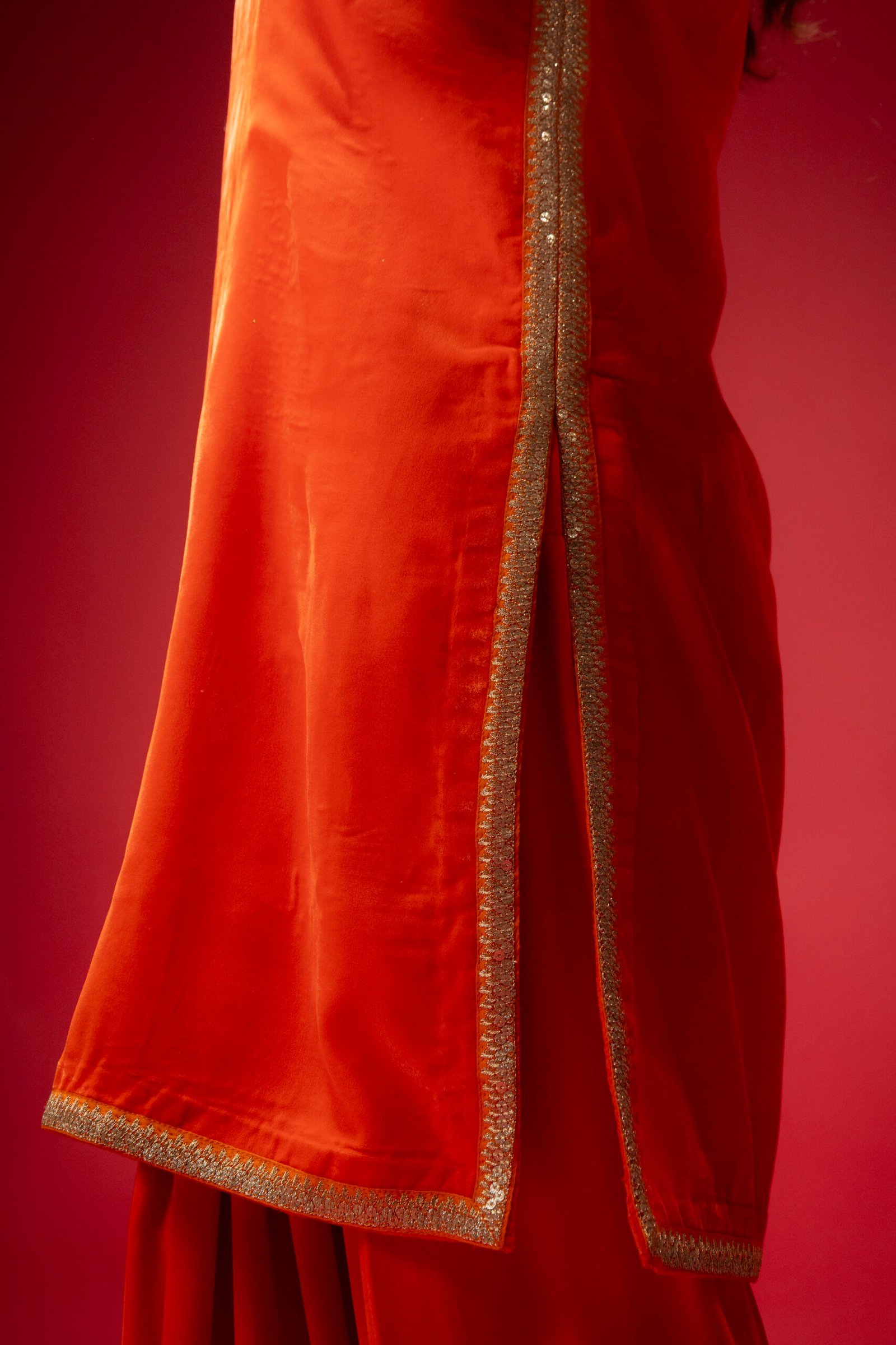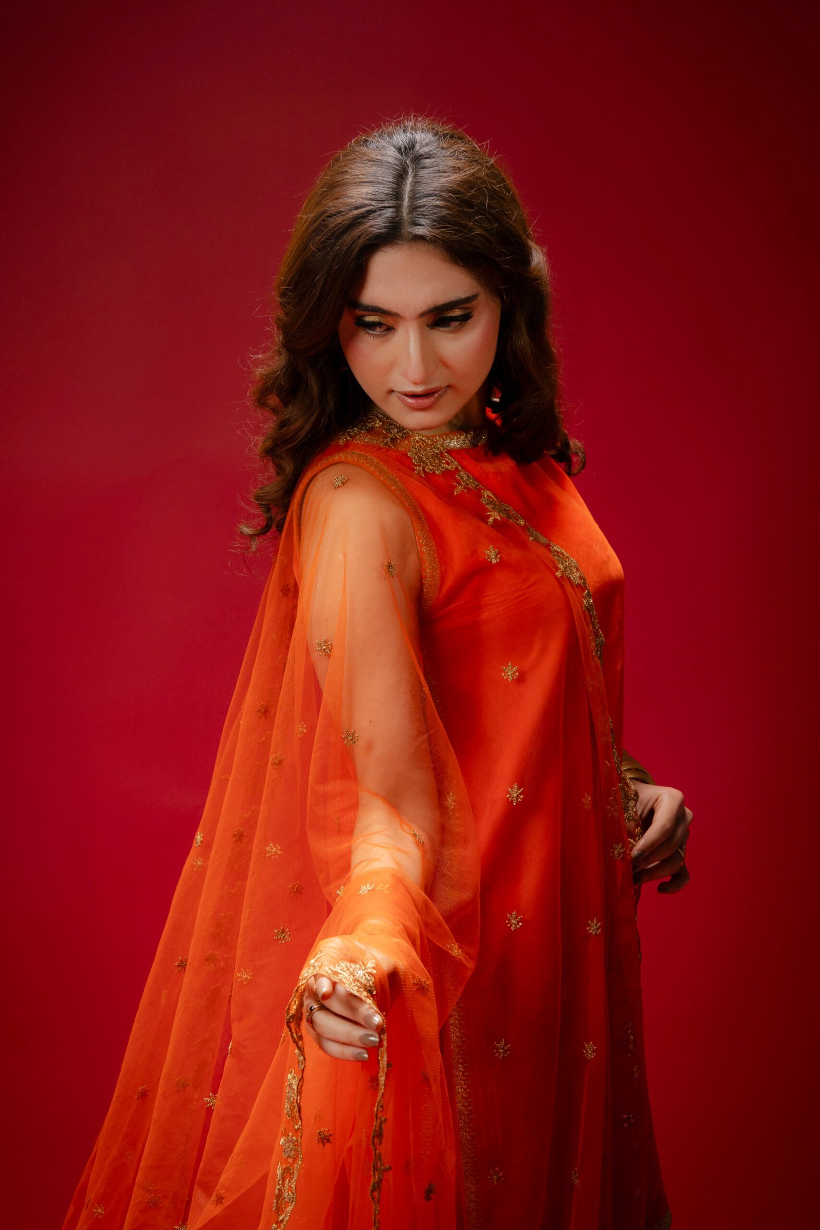 A perfect blend of elegance and simplicity, this orange velvet ensemble is designed to make a statement with subtle charm. The shirt is adorned with delicate lace, while the farshi shalwar adds a graceful, flowing silhouette enhanced by intricate lace detailing. Completing the set is a beautifully embellished net dupatta, adding a soft, festive touch to this classic and affordable dress.